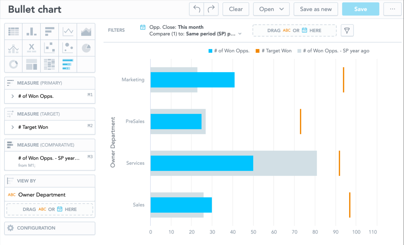 Bullet charts have the following sections: Measure (Primary) , Measure (Target) , Measure (Comparative) , View by , and Configuration .