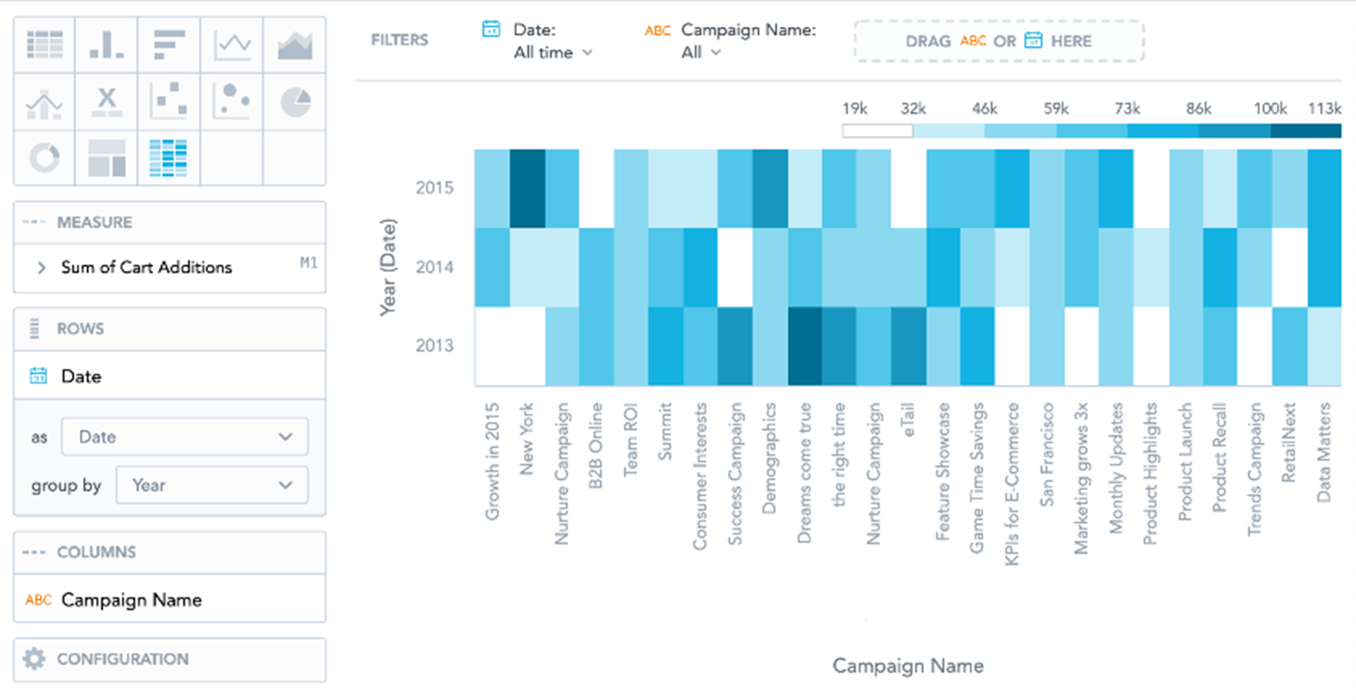 Heatmaps have the following sections: Measure , Rows , Columns , and Configuration .