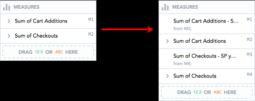 - They have SP year ago or previous period added to their name. Click the name to rename them. For details, see Renaming Measures.
